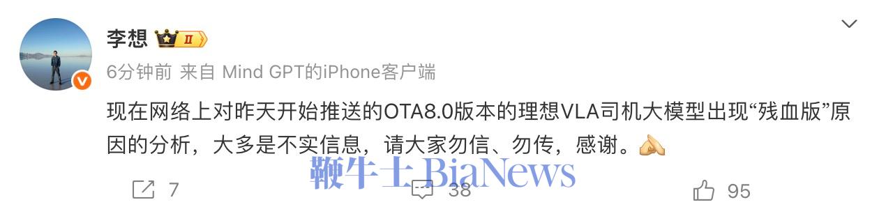 李想称,“现在网络上对昨天开始推送的OTA8.0版本的理想VLA司机大模型出现‘残血版’原因的分析,大多是不实信息,请大家勿信、勿传,感谢。”